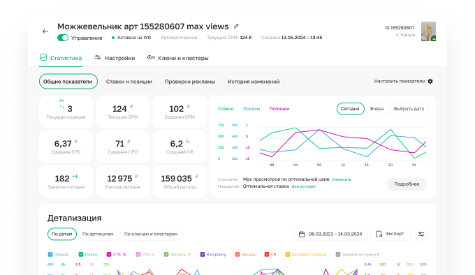 Удобные инструменты для продвижения и аналитики позиций, а также обучающийся Автобиддер для быстрого выхода в топ и роста продаж на Вайлдберриз![]()