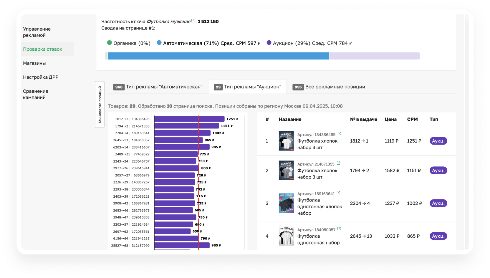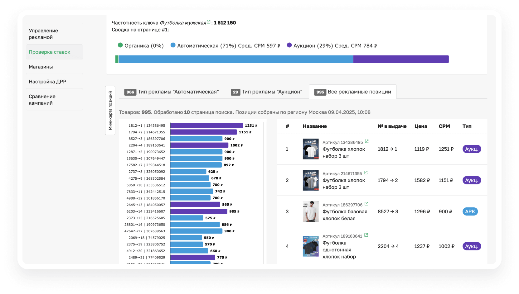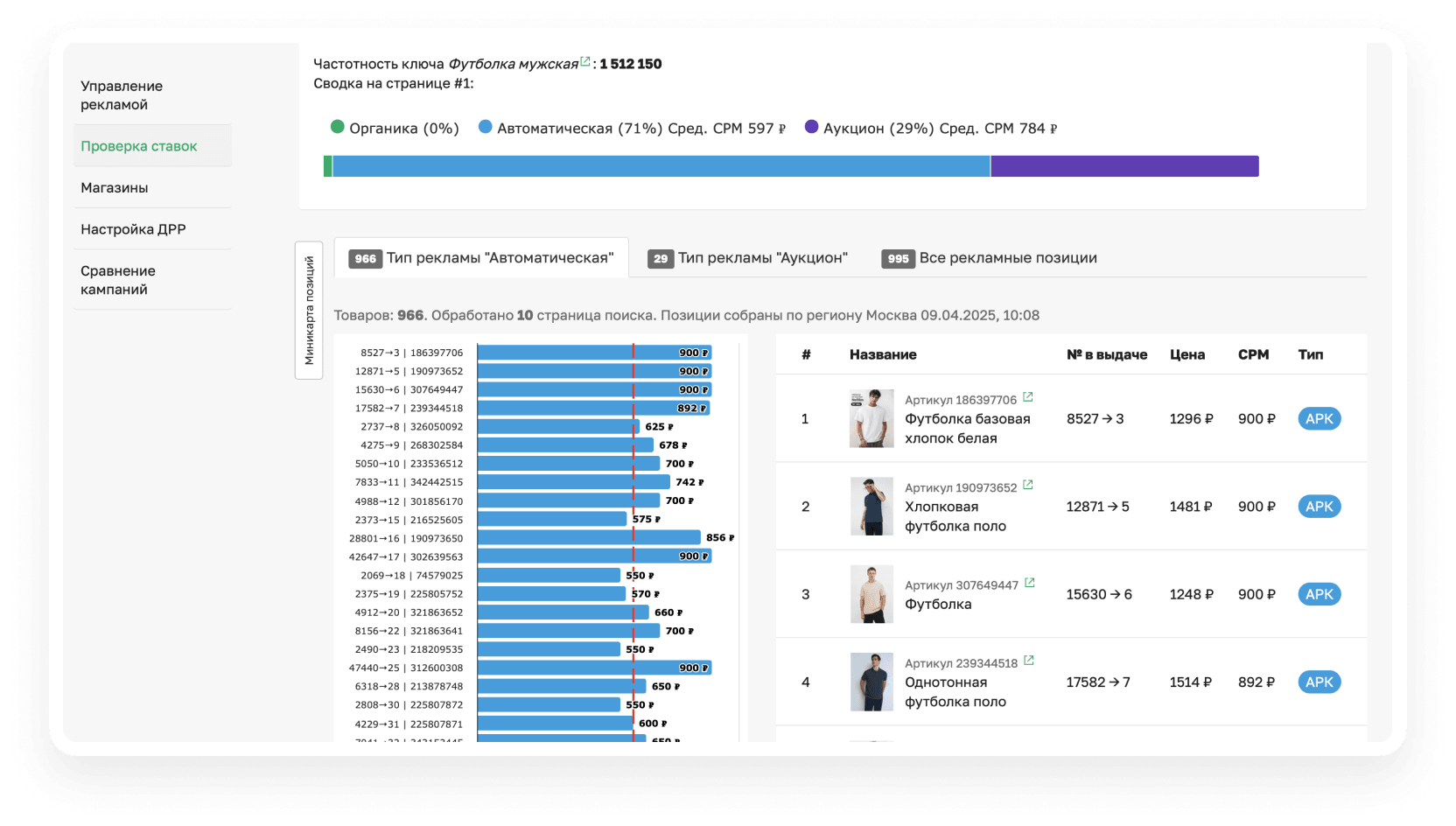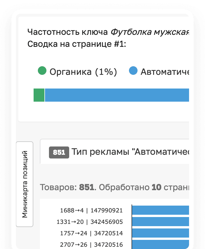 Точные рекламные ставки Вайлдберриз по ключу показывает сервис Sellego «Проверка ставок». Наш бот по ставкам ВБ отображает позиции карточек и их текущую рекламную ставку в Авторекламе и в рекламе Аукцион. В результатах выдачи можно увидеть артикулы, которые рекламируются по завышенным и заниженным ставкам. Помимо этого, выводится средняя CPM на Wildberries по анализируемому ключу.